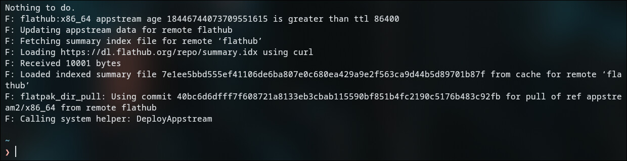 Hello. I’ve been having trouble trying to check for package updates through flatpak command line. After passing the -v switch into flatpak, flathub seems to be timing out trying to retrieve a signature file.