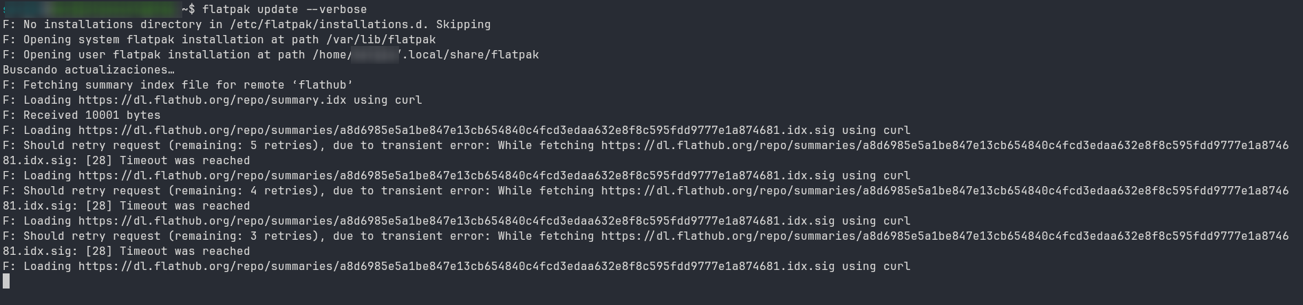 F: Should retry request (remaining: 1 retries), due to transient error: While fetching https://dl.flathub.org/repo/summaries/[redacted].idx.sig: [28] Timeout was reached