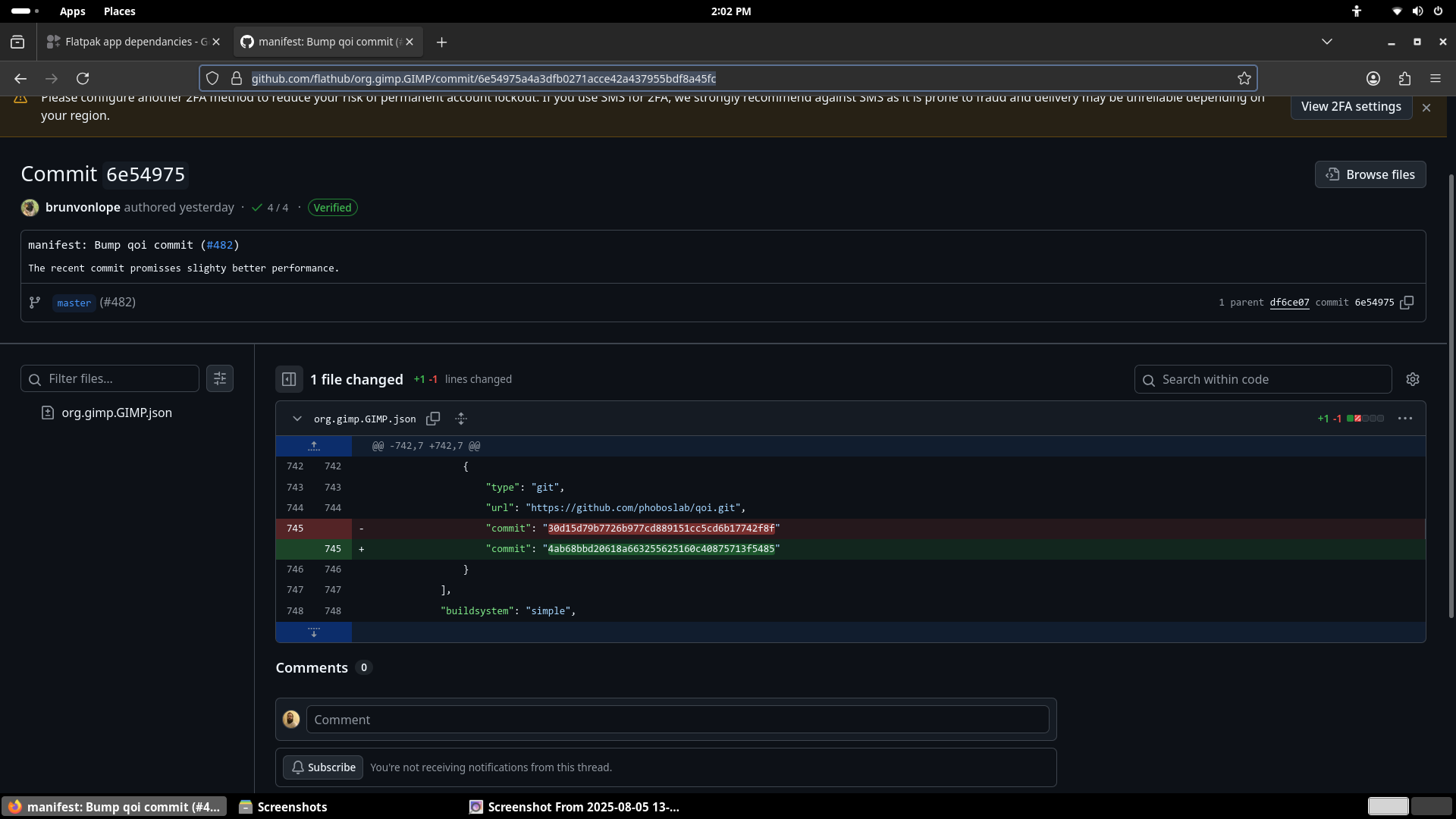 You can see the old code in red and the new code in green. This manifest is in .json format. I don’t understand json well, and so I use the other .yml format for manifests myself. But this shows that a dependency named qoi got updated in yesterday’s Gimp flatpak update.
