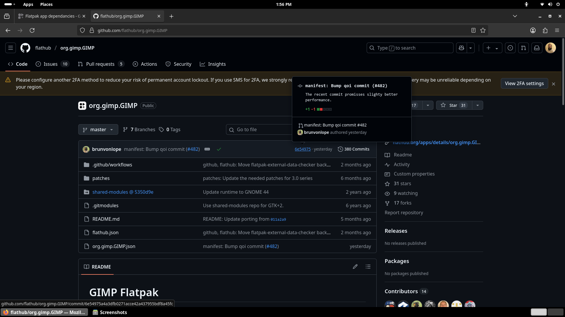 Do you see that grey number combo in front of “yesterday” some clock symbol, and “380 Commits”? If you put your mouse pointer on it, you get a popup like in the screenshot. Click on the number. - This is one of the commit manifests you were supposed to look at. manifest: Bump qoi commit (#482) · flathub/org.gimp.GIMP@6e54975 · GitHub