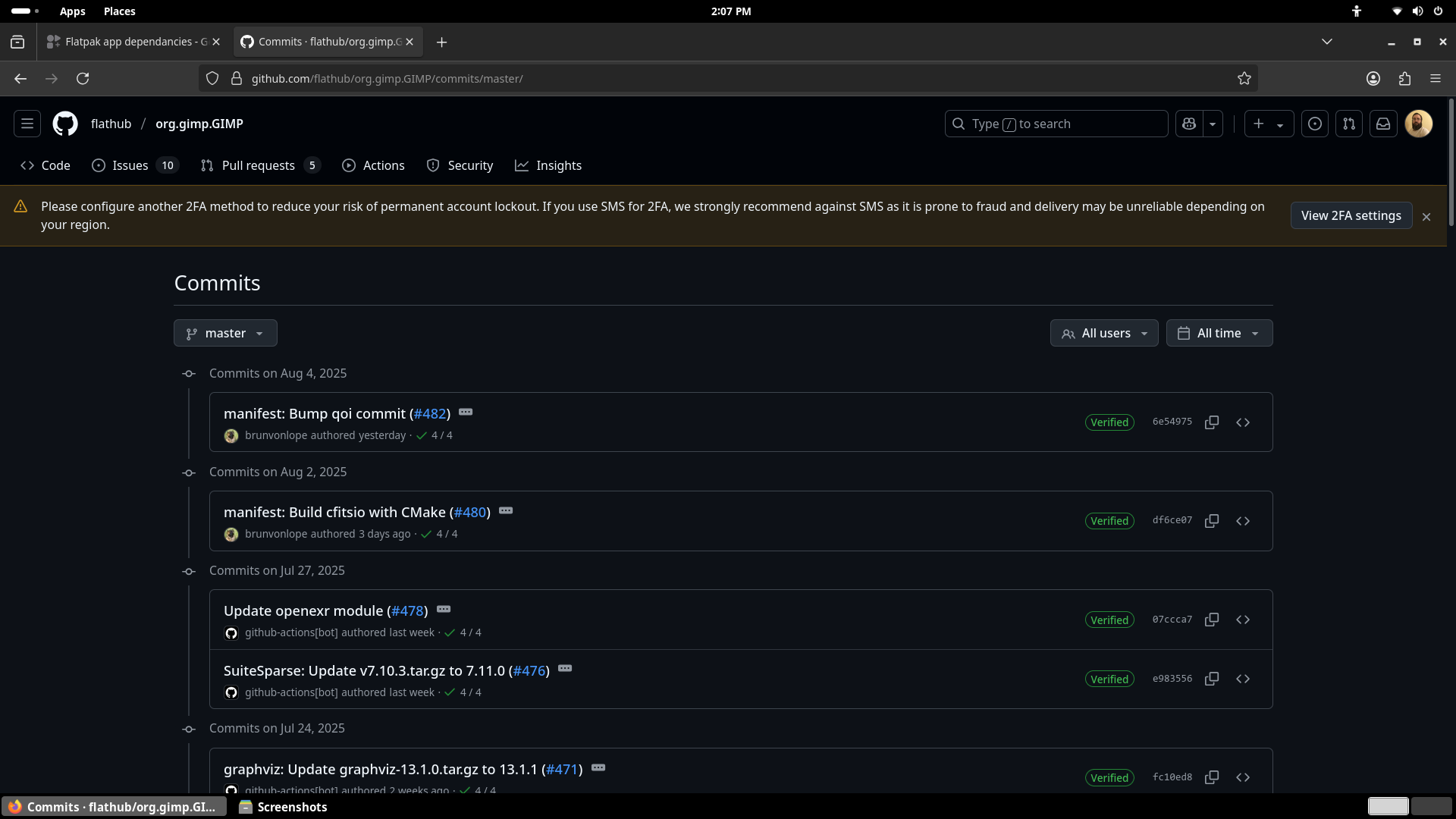 You can see that Gimp frequently updates dependencies. On Aug 2, the Gimp flatpak update was due to the Gimp maintainers changing how a dependency got added to the Gimp flatpak. It looks like the Gimp maintainers might use an automated update script. You can expect frequent dependency updates from the Gimp flatpak.