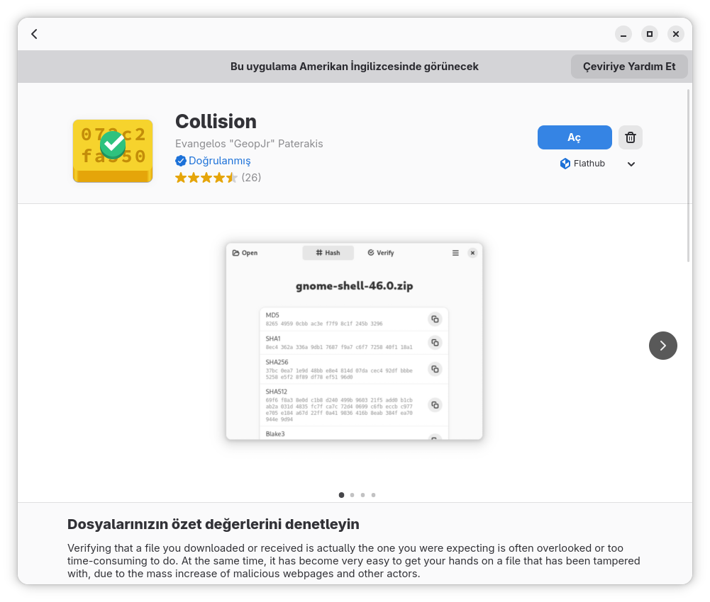 The result GNOME Software says Bu uygulama Amerikan İngilizcesinde görünecek (meaning: This app will appear in US English). On the other hand, I’m sure I have translated the app, and it is already Turkish.